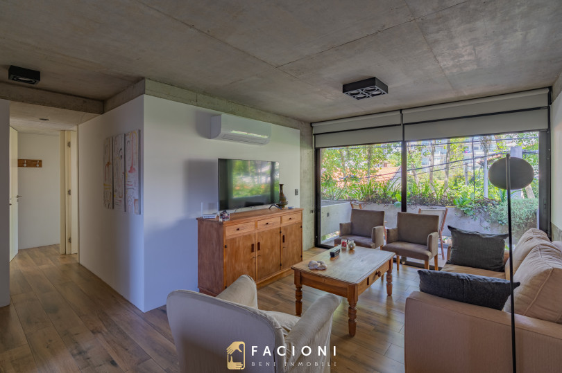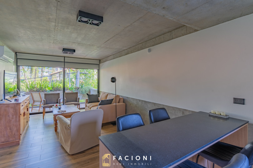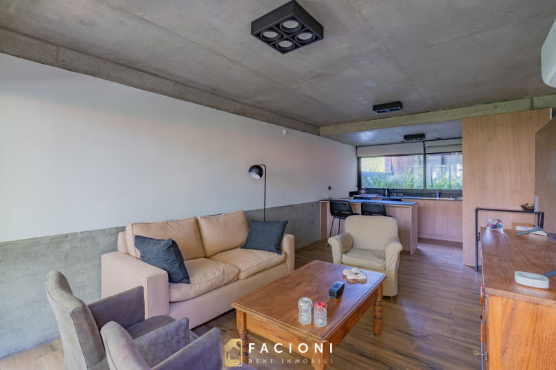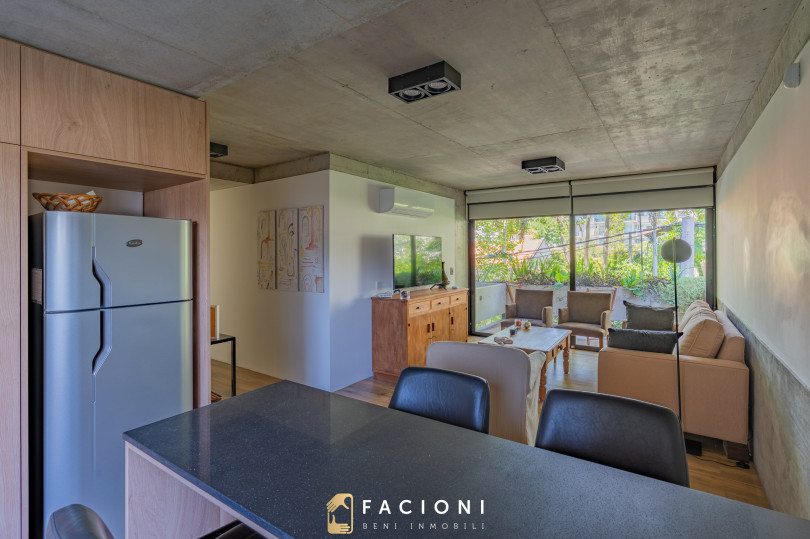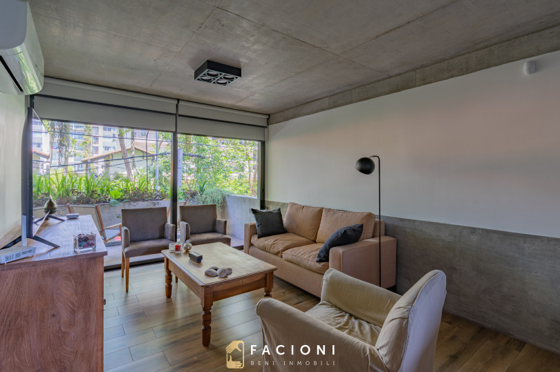 El living comedor al frente, muy luminoso, se integra a la cocina con barra desayunadora, generando un espacio amplio y cómodo para el uso diario. Desde el living se accede a un gran balcón saliente al frente, ideal para disfrutar del entorno urbano.