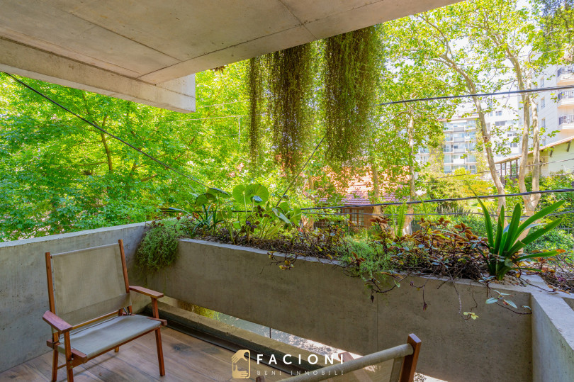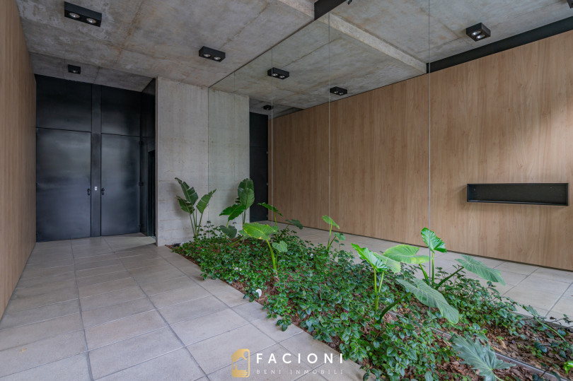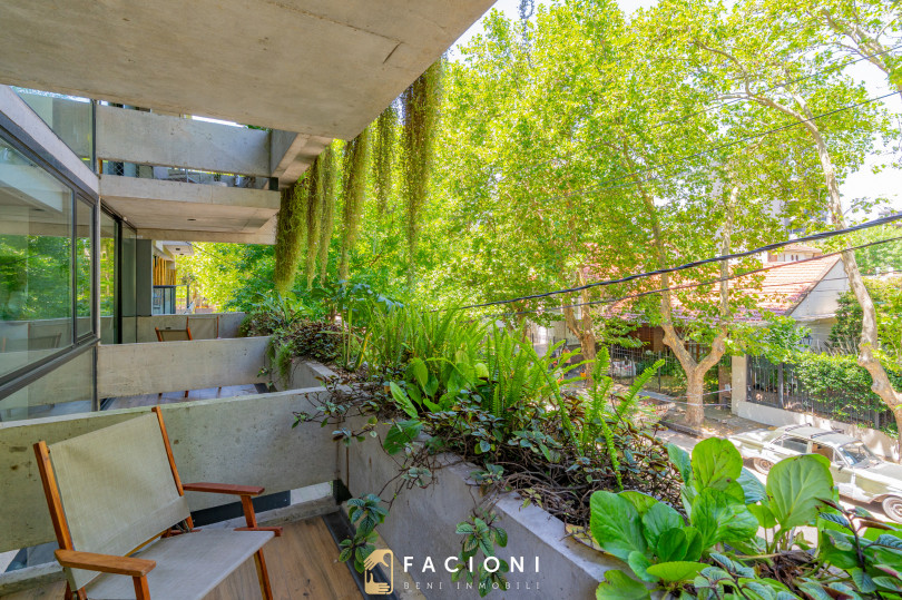 Edificio de arquitectura moderna en hormigón visto, con jardines colgantes mantenidos por Vivero Antonucci, que aportan valor estético y calidad ambiental al conjunto.