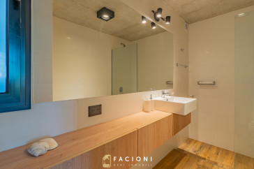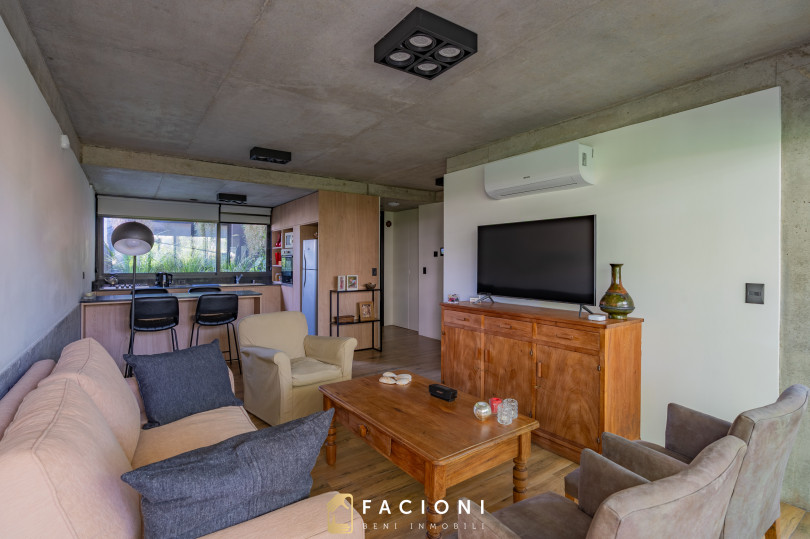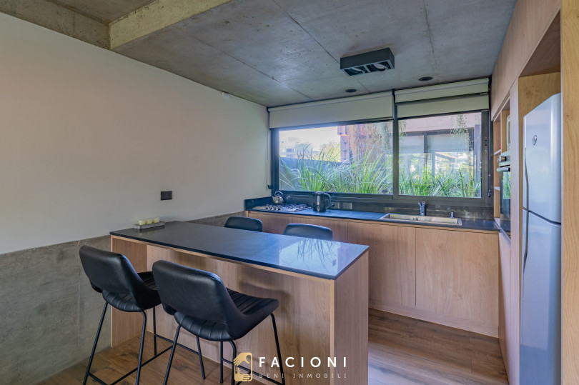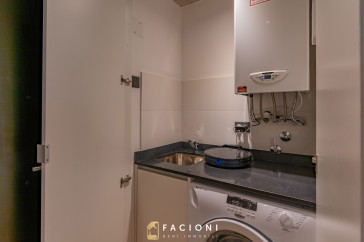 El departamento cuenta con una distribución moderna y funcional. Al ingresar, un pasillo de recepción conduce a un lavadero independiente, oculto mediante mobiliario a medida.