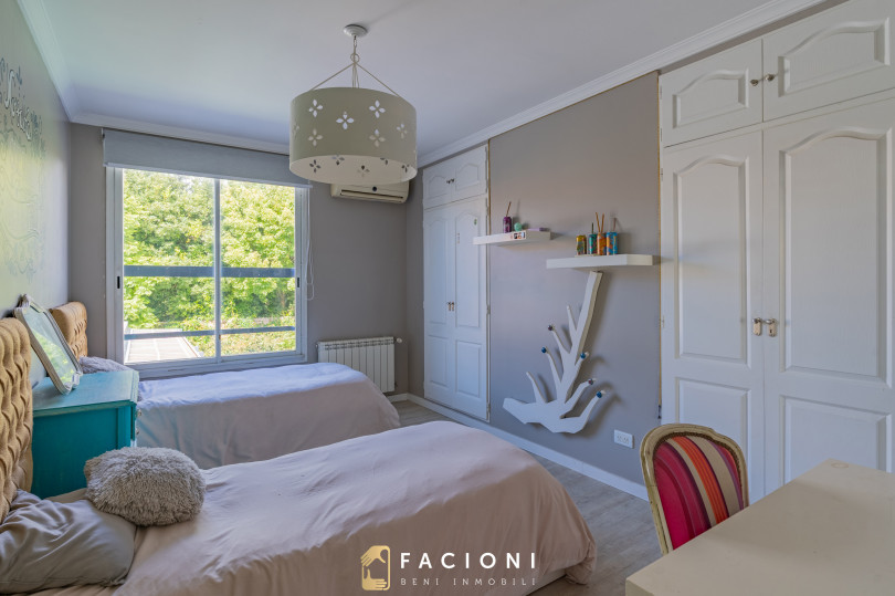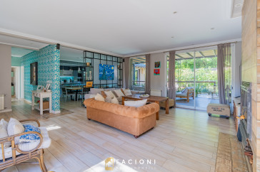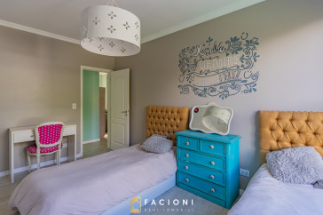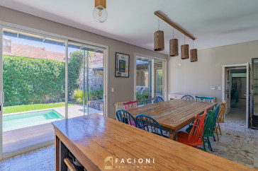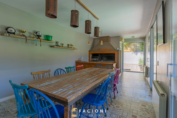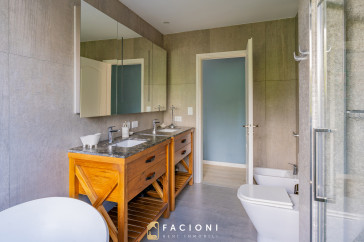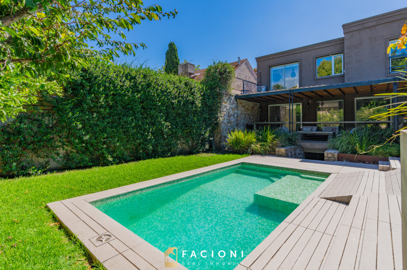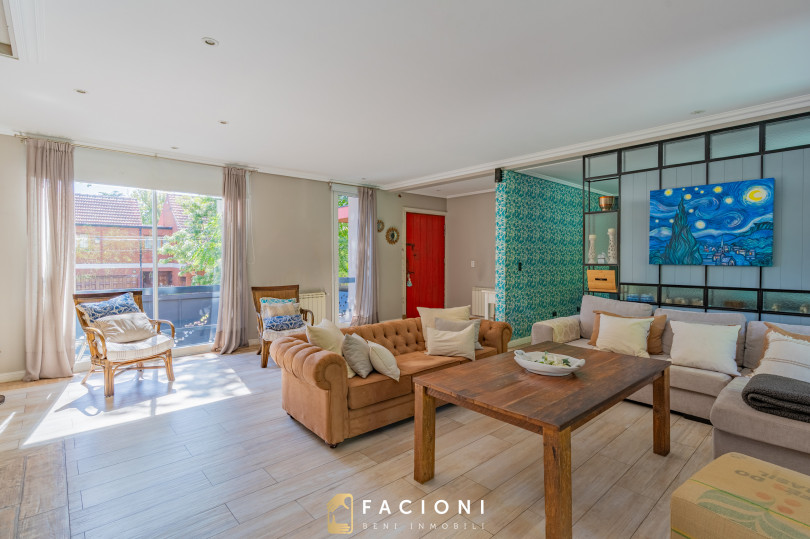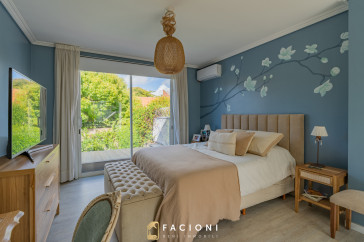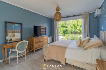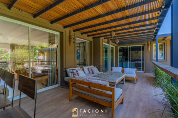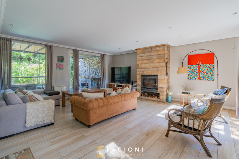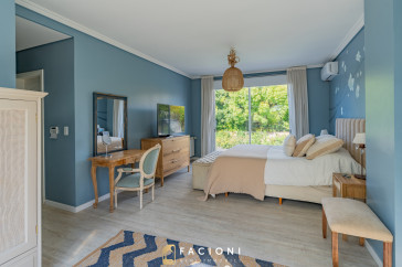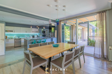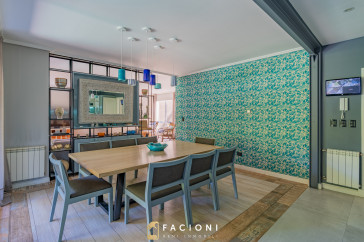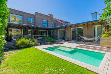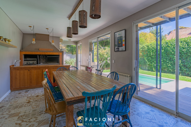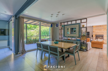 El recorrido comienza en un gran living-comedor con hogar a leña, donde la luz natural inunda cada rincón, creando un ambiente acogedor y sofisticado. El espacio, ideal para momentos de relajación y encuentro, se complementa con un toilette de recepción y un escritorio privado, perfecto para quienes trabajan desde casa. La cocina-comedor, equipada con muebles de la prestigiosa marca Johnson, es un sueño para los amantes de la gastronomía, y se conecta con un quincho con parrilla a carbón para disfrutar de reuniones al aire libre durante todo el año. Desde allí, las vistas al jardín y a la pileta climatizada son simplemente inigualables.