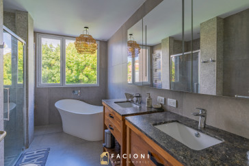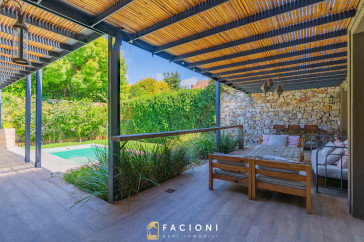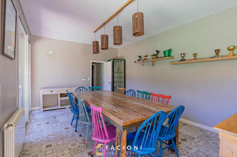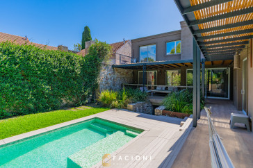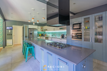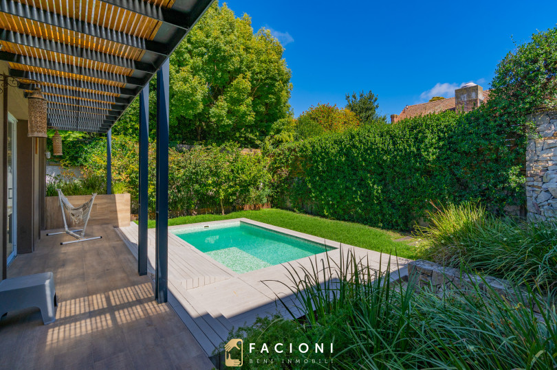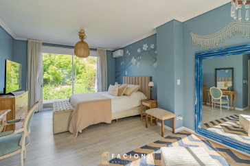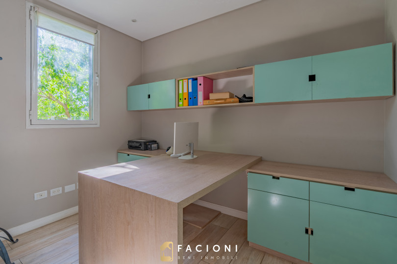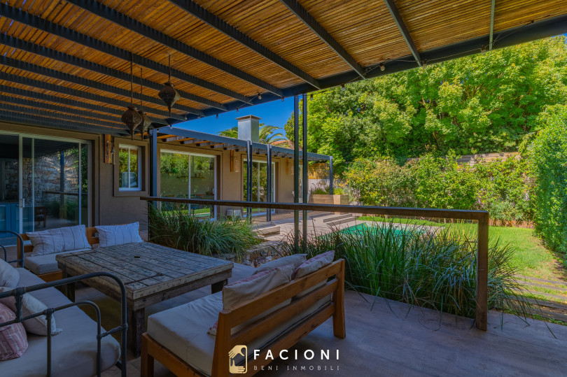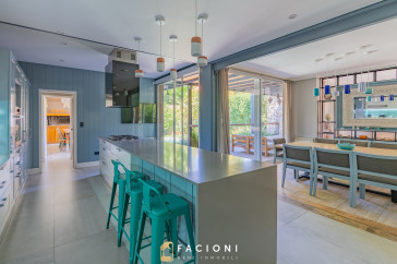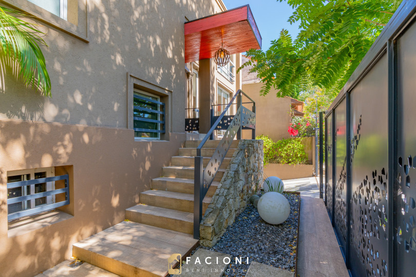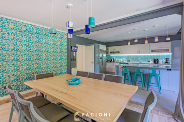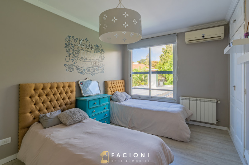 El recorrido comienza en un gran living-comedor con hogar a leña, donde la luz natural inunda cada rincón, creando un ambiente acogedor y sofisticado. El espacio, ideal para momentos de relajación y encuentro, se complementa con un toilette de recepción y un escritorio privado, perfecto para quienes trabajan desde casa. La cocina-comedor, equipada con muebles de la prestigiosa marca Johnson, es un sueño para los amantes de la gastronomía, y se conecta con un quincho con parrilla a carbón para disfrutar de reuniones al aire libre durante todo el año. Desde allí, las vistas al jardín y a la pileta climatizada son simplemente inigualables.